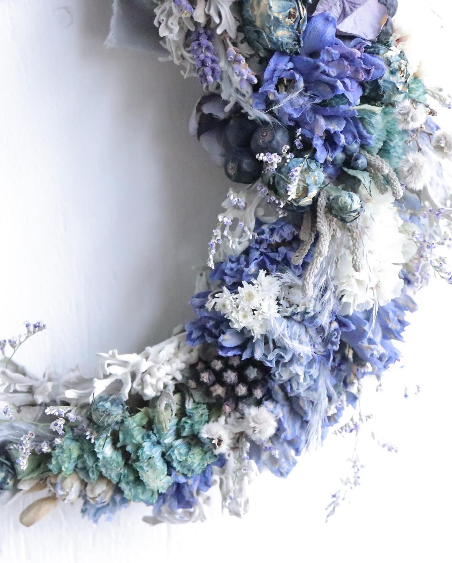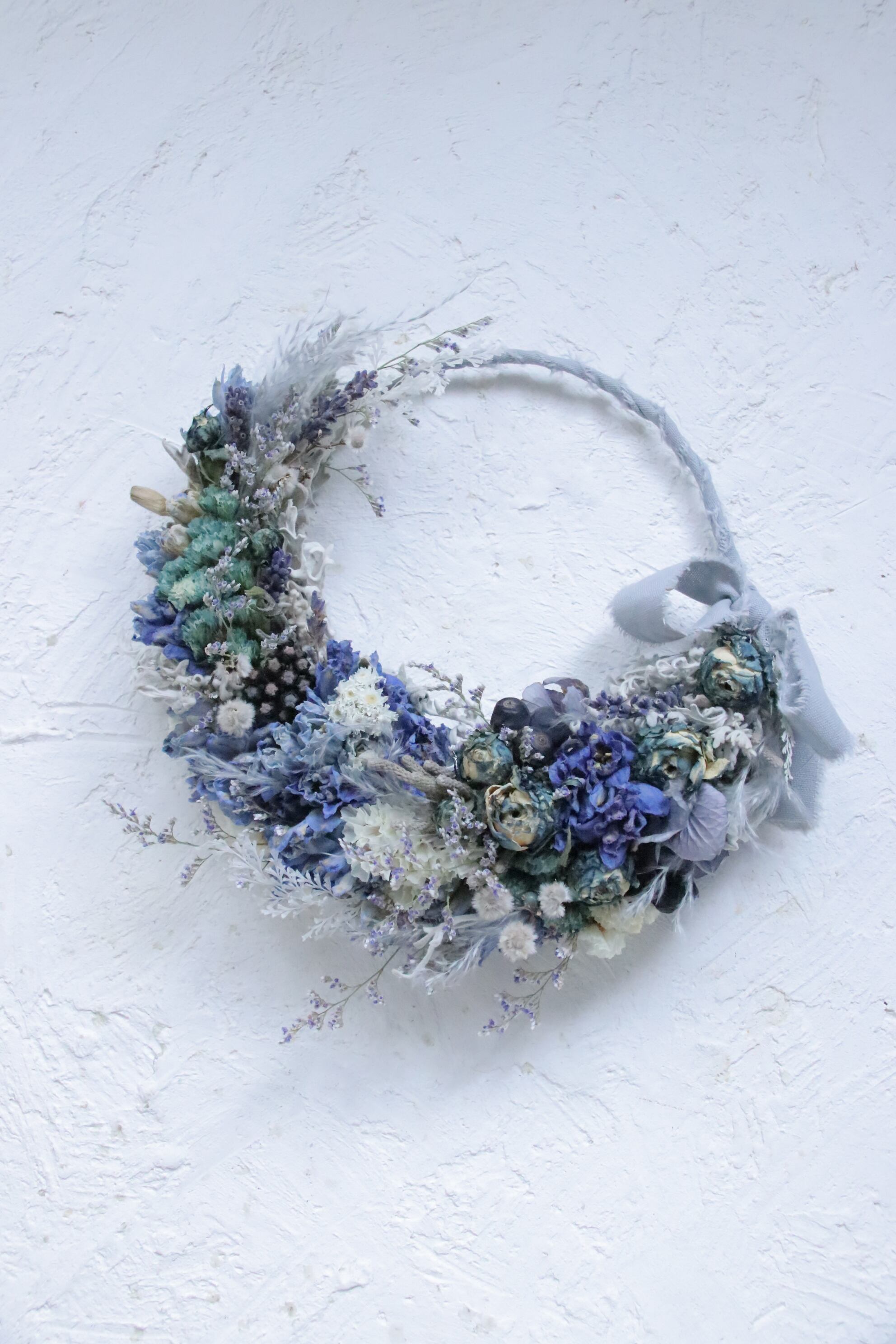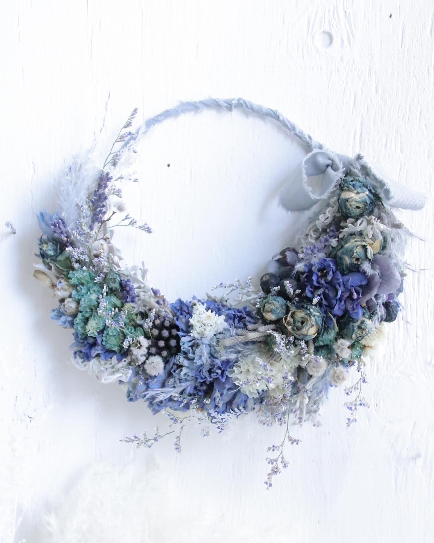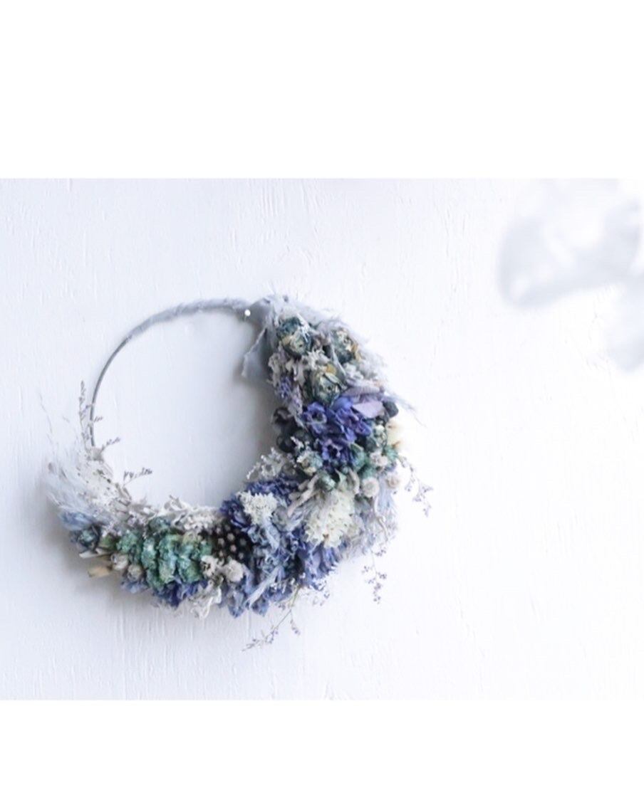 ブルー系ドライフラワーで三日月リースに仕立てました。
