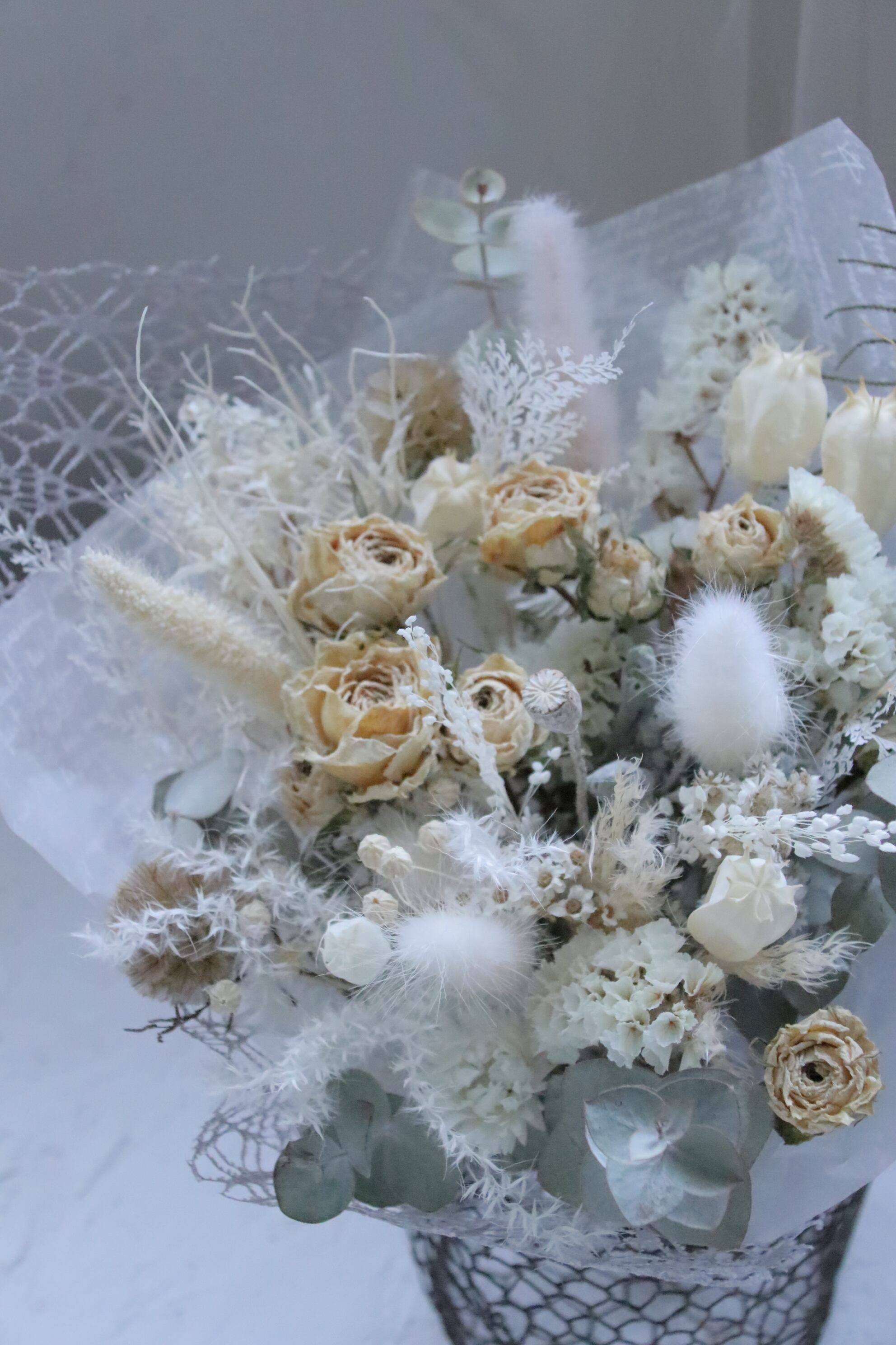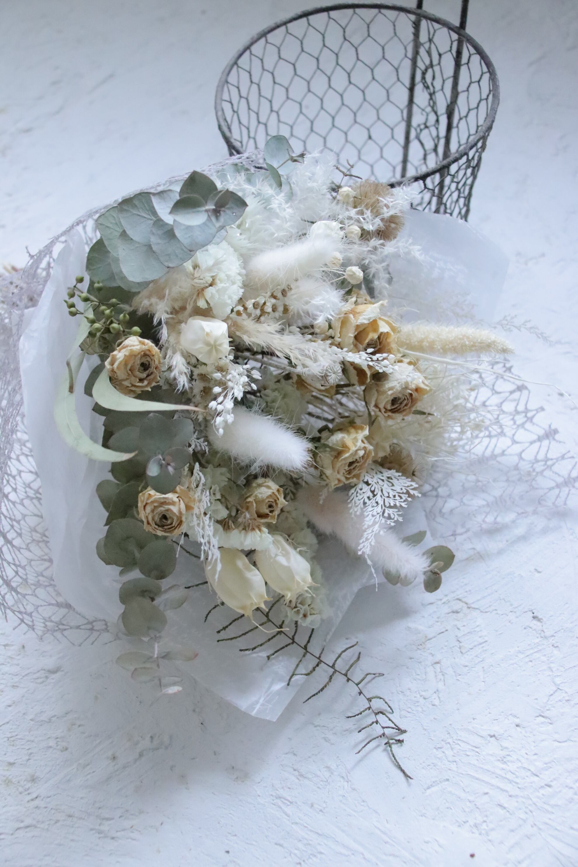 プリザーブドフラワーとドライフラワーを組み合わせて束ねていますが、全体的にホワイト〜ベージュカラーで色褪せた感じもわかりにくく馴染んでゆきます。
