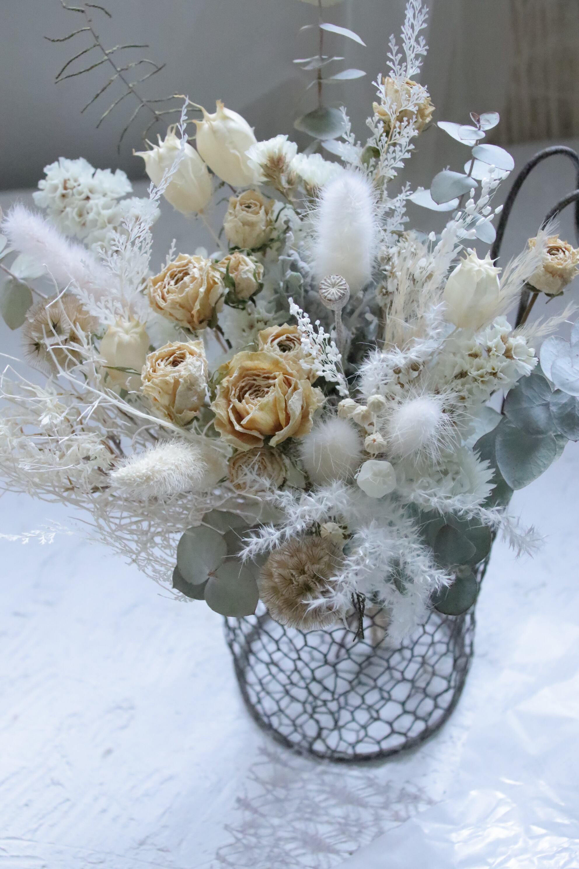 エクリュカラーの花束とシャビーシックなアイアンバスケット