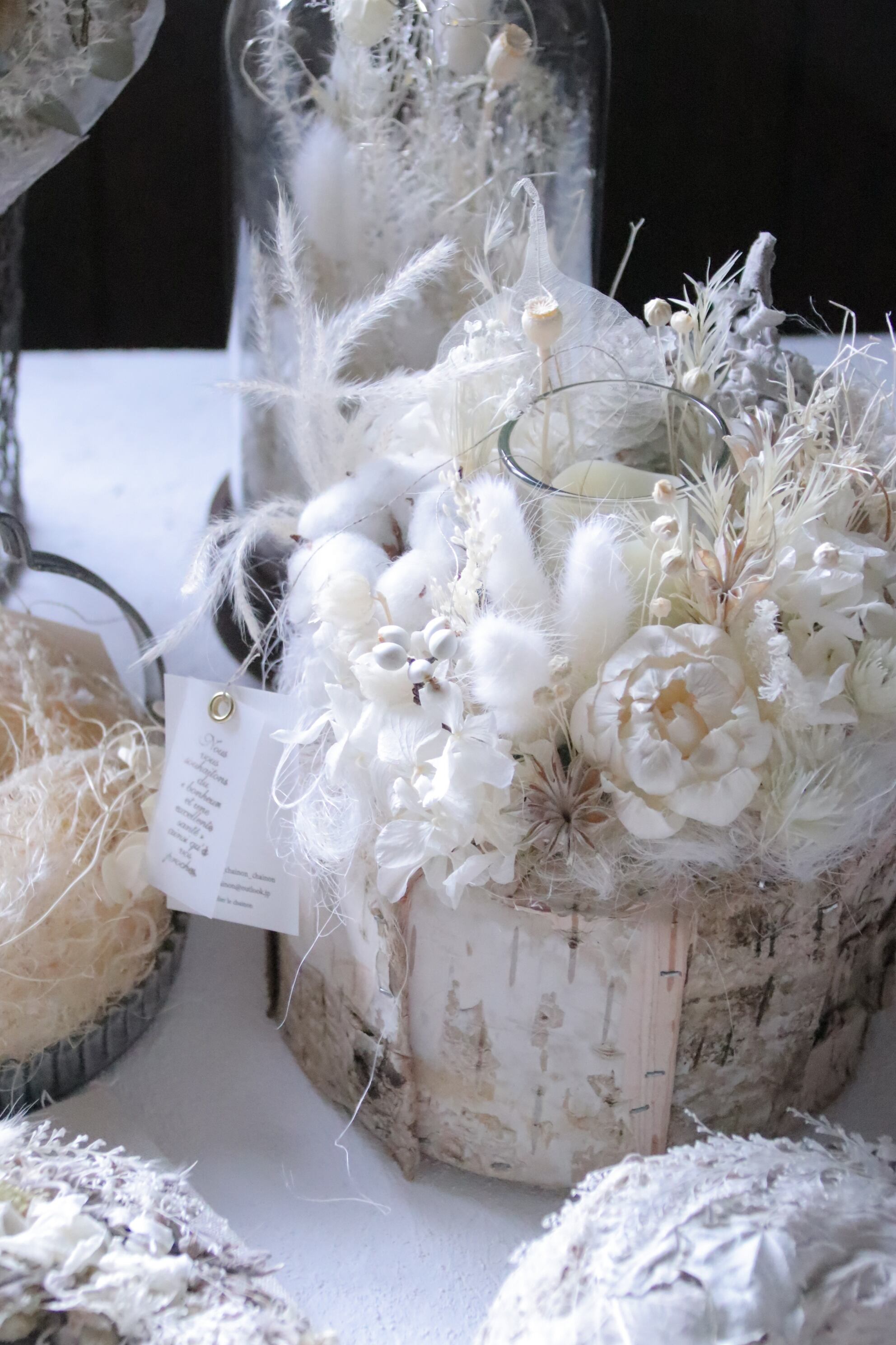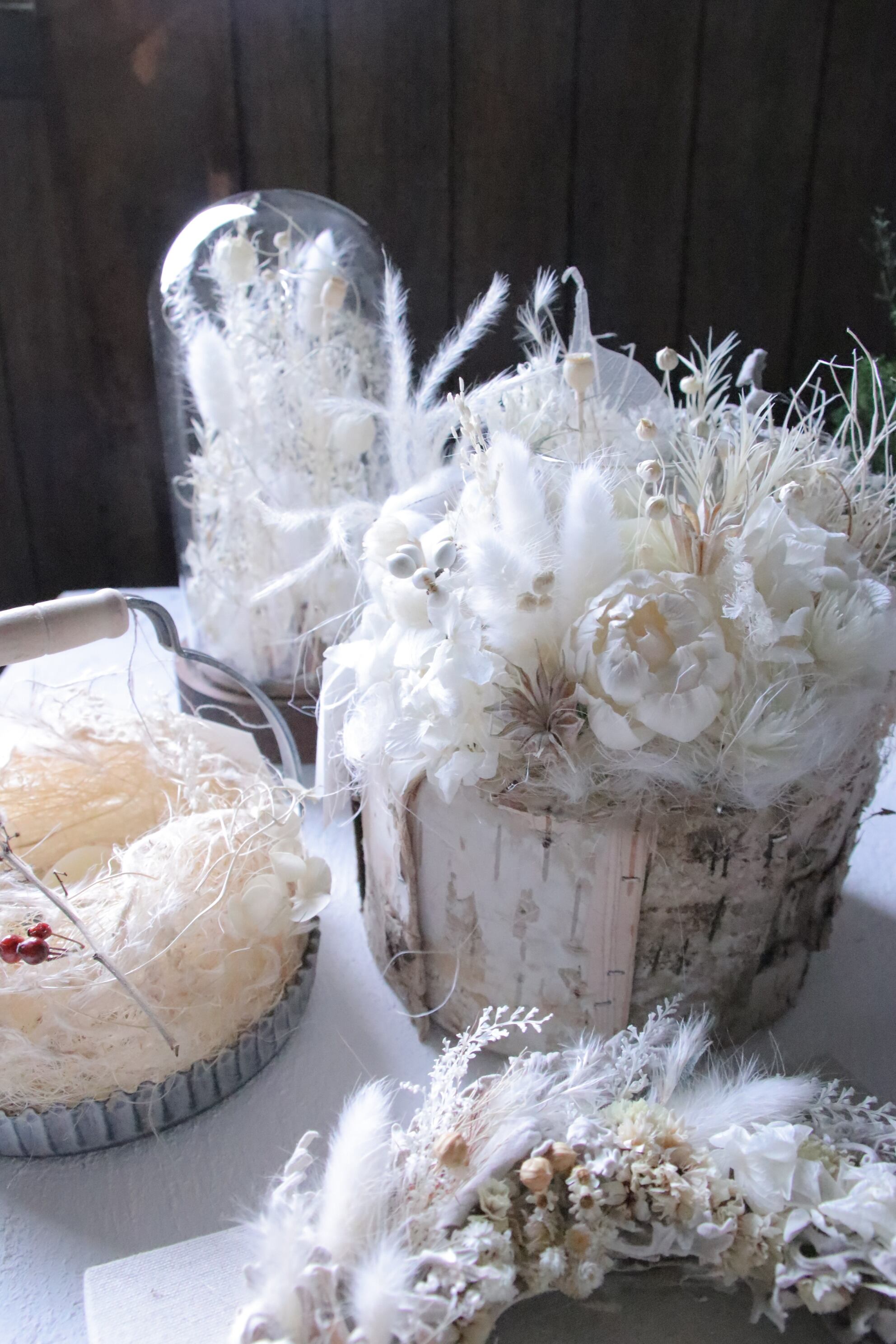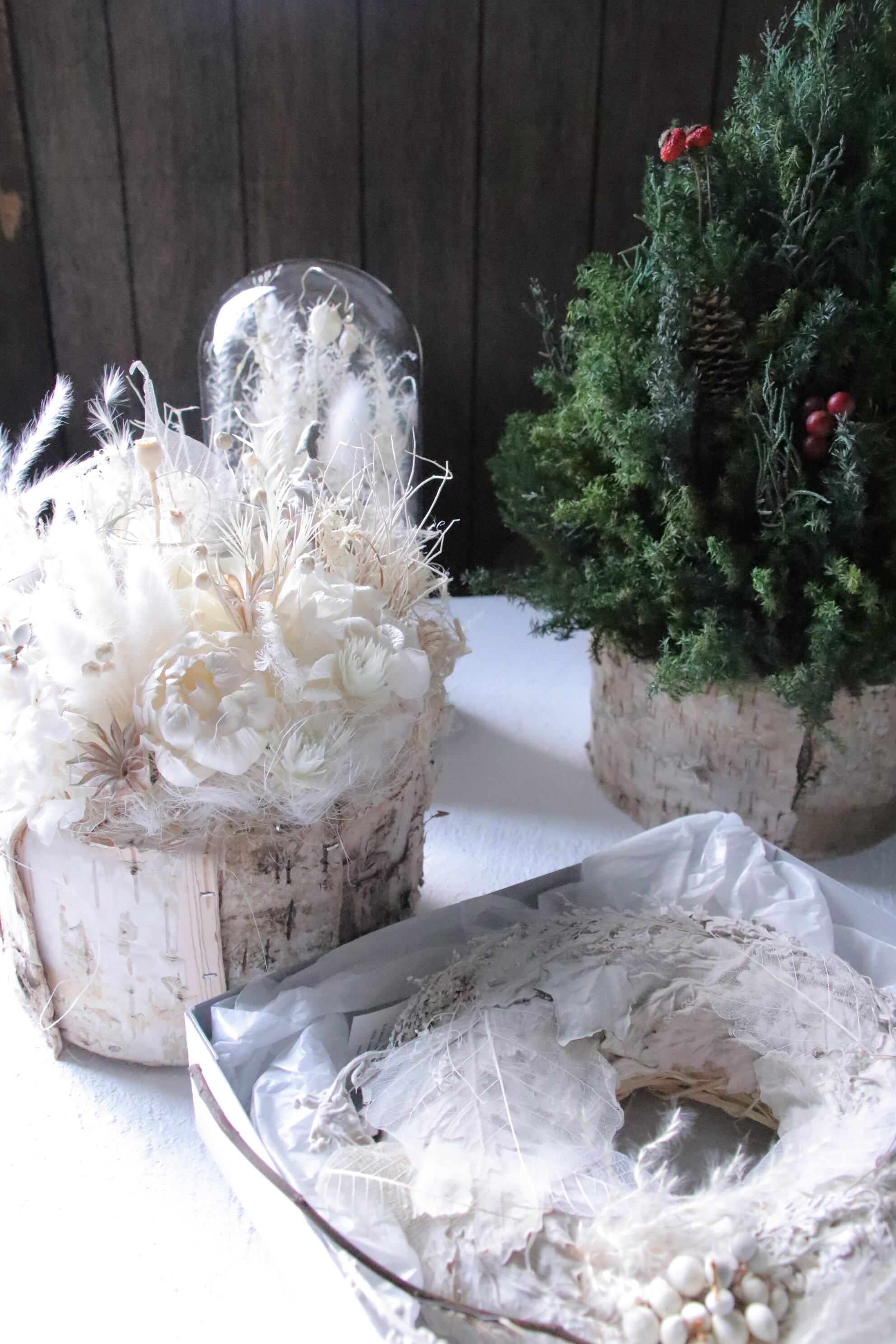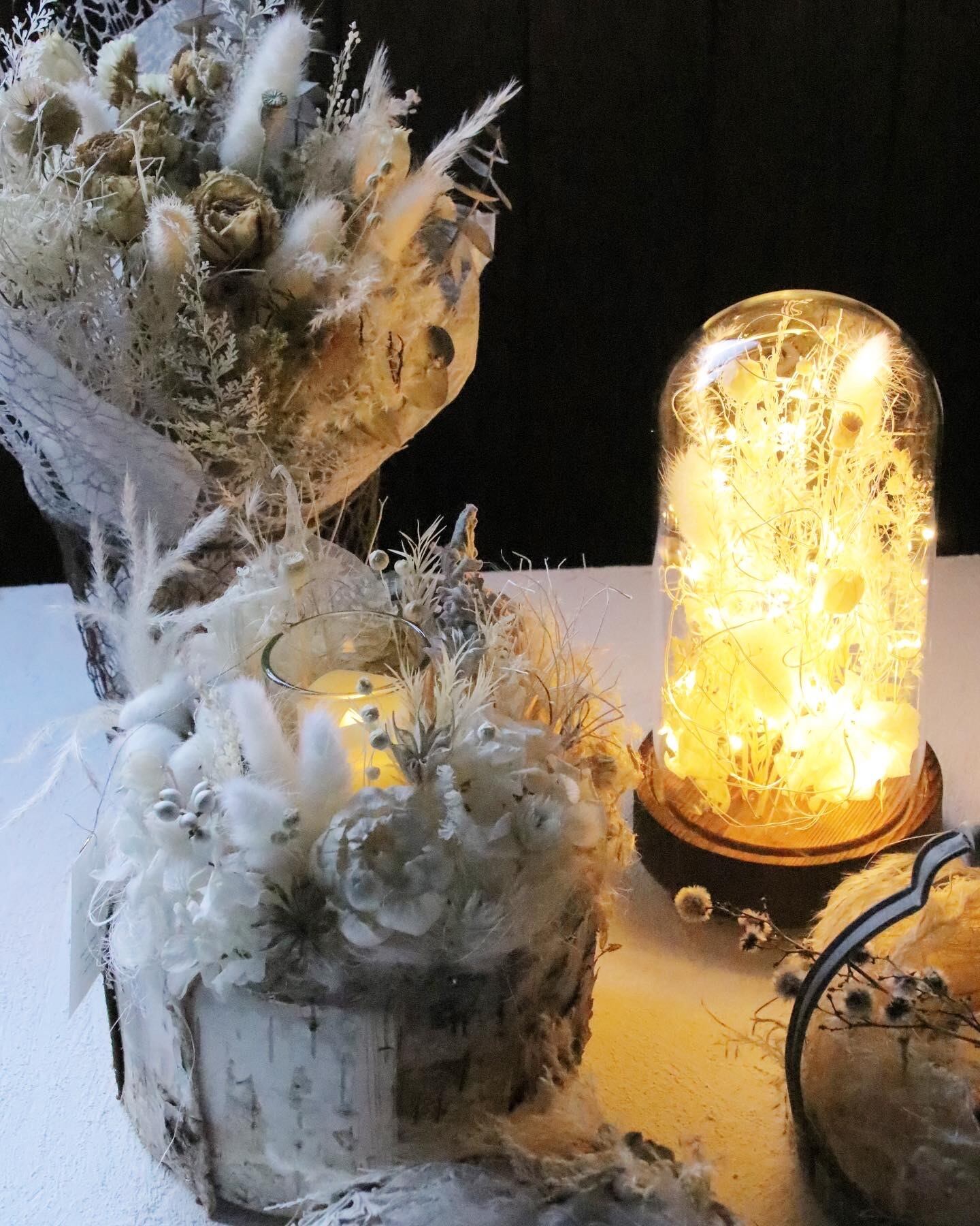 アレンジ真ん中にガラスベースに入れたLEDキャンドル
